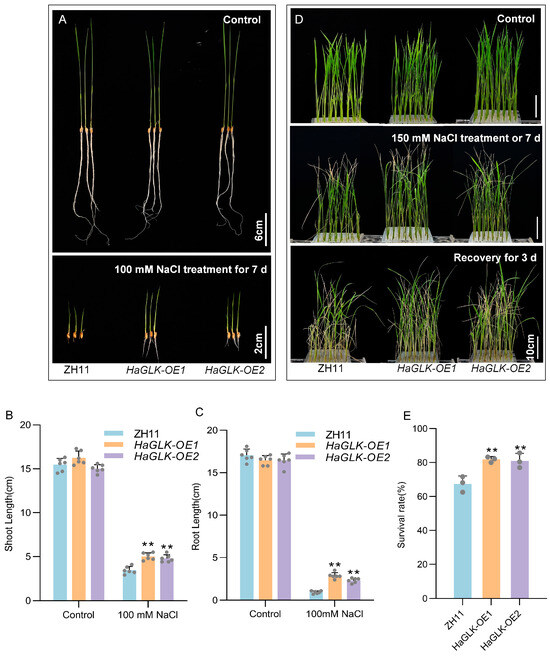 Phenotypic analysis of the HaGLK transgenic lines under NaCl treatment. (A) Germination stage—sprouting seeds were supplemented with 100 mM NaCl (bar = 2 cm) and control without any additional additives (bar = 6 cm); (B,C) shoot and root length of plants under 100 mM NaCl treatment (n = 6 biological replicates); (D) seedling stage—2-week-old seedlings were supplemented with 150 mM NaCl and control without any additional additives (bar = 10 cm); (E) survival rates of seedlings with 150 mM NaCl (n = 3 biological replicates). Data are means ± SD (Student’s t tests, ** p < 0.01). Each dot represents a biological replicate.
