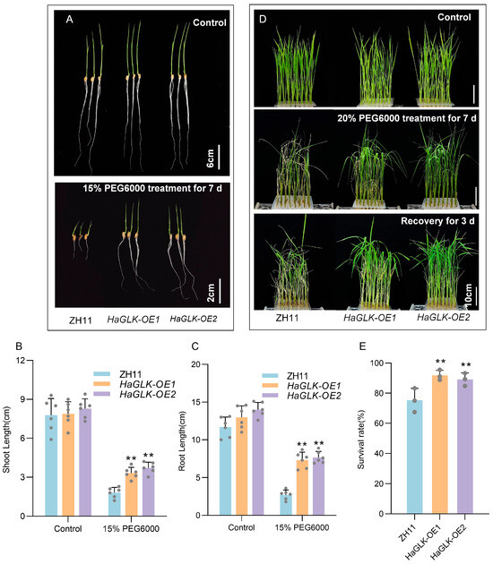 Phenotypic analysis of the HaGLK transgenic lines under PEG6000 treatment. (A) Germination stage—sprouting seeds were supplemented with 15% PEG6000 (bar = 2 cm) and control without any additional additives (bar = 6 cm); (B,C) shoot and root length of plants under 15% PEG6000 treatment (n = 6 biological replicates); (D) seedling stage—2-week-old seedlings were supplemented with 20% PEG6000 and control without any additional additives (bar = 10 cm); (E) survival rates of seedlings with 20% PEG6000 (n = 3 biological replicates). Data are means ± SD (Student’s t tests, ** p < 0.01). Each dot represents a biological replicate.