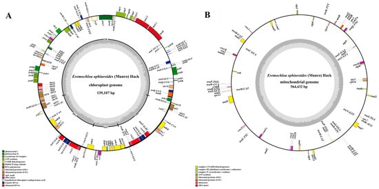 Combining second-generation (depths of 1150X) and third-generation sequencing (366X), the chloroplast and mitochondrial genomes of centipedegrass were successfully assembled into single circular structures (Figure 1), with a total length of 139,107 bp and 564,432 bp, respectively. The chloroplast genome contains a total of 132 genes, comprising 86 protein-coding genes, 38 tRNA genes, and 8 rRNA genes (Figure 1A, Table S3), while the mitochondrial genome contains 63 genes, including 37 protein-coding genes, 21 tRNA genes, and 5 rRNA genes (Figure 1B, Table S3). Notably, no pseudogenes were identified within the organelle genomes of centipedegrass.