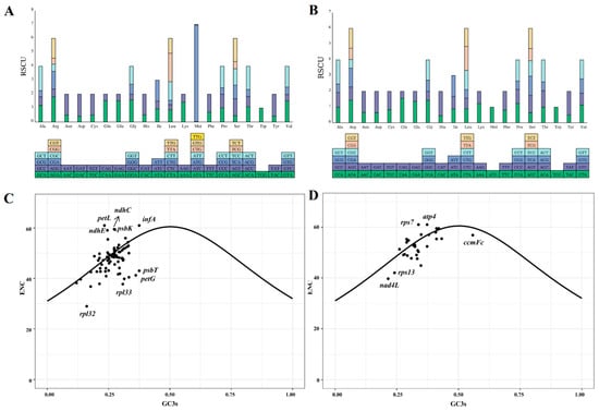 The relative synonymous codon usage values of each codon of chloroplast (A) and mitochondrial (B) genes. ENC-GC3s plots of chloroplast (C) and mitochondrial (D) genes of centipedegrass. The solid curve indicates the predicted gene positions when codon usage bias is determined exclusively by GC3s composition. (ENC: effective number of codons; GC3s: guanine+cytosine content at third synonymous codon positions).