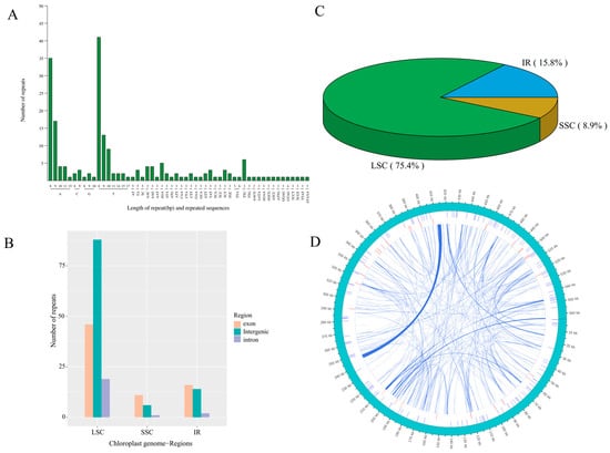 The type and number of simple sequence repeat (A), the number of repeats in each genomic region (exon, intergenic, and intron) in LSC, SSC, IR regions (B), the percentage of repeats in each LSC, SSC, IR regions (C) in chloroplast genome of centipedegrass, and a circus plot showing repeat sequences in the mitochondrial genome of centipedegrass (D). The outermost circle represents the mitochondrial genome sequence, followed inwardly by simple sequence repeats, tandem repeats, and dispersed repeats.