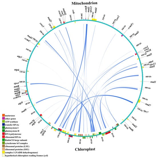 Homologous sequences between the chloroplast and mitochondrial genomes were used to identify gene transfer events. By using blast v2.10.1+ software with an E-value of 1 × 10−5, the chloroplast genome sequences were aligned to the mitochondrial genome. The resulting alignments were subsequently visualized using circus v0.17.1 [27].