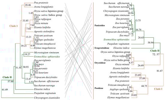 The tangled tree of Gramineae based on shared chloroplast (right) genes and mitochondrial (left) genes. The number in the node indicated the divergence time (Mya). The mitochondrial genome sequenced in this study was highlighted in green.