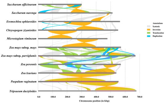 Given the prevalence of abundant structural variations (SVs) within plant mitochondrial genomes, we conducted pairwise alignments and variation detection among 11 Panicoides mitochondrial genomes (Figure 6). We detected a total of four SVs, including syntenic, inversion, translocation, and duplication, which underscore the occurrence of large-scale rearrangements within these mitochondrial genomes. Notably, one large syntenic region and a significant inversion variation were observed between the mitochondrial genomes of centipedegrass and Saccharum narenga, while one large inversion and two duplication events were identified between the mitochondrial genomes of centipedegrass and Chrysopogon zizanioides. The annotations revealed that these SVs impacted numerous genes (Table S7), highlighting the conservation of gene function despite the structural rearrangements for Gramineae mitochondrial genomes.
