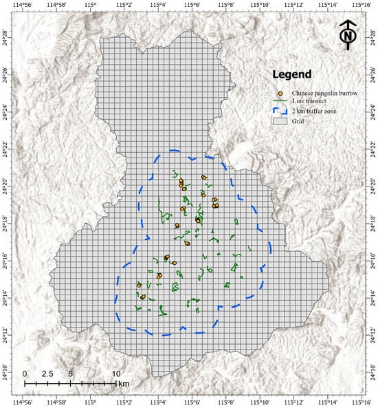 We intermittently conducted field surveys of the Chinese pangolin populations from May 2022 to March 2023. All surveys were performed by a fixed, professionally trained field team, ensuring standardized data collection procedures and minimizing observer-related biases. We divided the study area into 600 m × 600 m grids with reference to the average home range of Chinese pangolins []. Based on the field topography, line transects of >600 m were set within 75 grids, reaching 32.60% of the total grids within the 2 km buffer zone, which is the core area where Chinese pangolins are distributed in this region, to record the locations and number of Chinese pangolin burrows observed. The number of burrows per unit length of line transect was used as a direct indicator of the habitat utilization intensity. We further transformed the intensity of the habitat utilization into binary data, assigning 1 to grids with burrow records and 0 to those without.