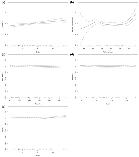 From the response curves, habitat utilization intensity increases with slope, as well as firstly exhibiting a nonlinear increasing trend with profile curvature, mainly concentrated in the −1 to 1 plateau (Figure 2a,b). The probability of Chinese pangolin occurrence shows a very slight decreasing trend with distance to water, slightly decreasing and then increasing with aspect, and a slightly increasing trend with slope (Figure 2c–e).