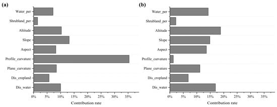 Contribution rates of primary environmental variables to the two models: (a) habitat utilization intensity model and (b) presence–absence model.