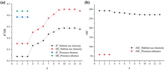 Moreover, in the presence–absence model, whether k = 1, 2 or 3, its R2 (0.585), DE (63.70%) and AIC (56.86) values remain essentially unchanged (Figure 4a,b). The presence–absence model does not capture the apparent nonlinear relationship with related environmental variables, whereas in the habitat utilization intensity model, the values of R2 and DE increase with the increasing of k. At k = 10, R2 (0.488) and DE (65.30%) are the highest and the AIC value (271.01) is the lowest (Figure 4a,b).
