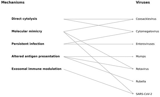 These include direct cytolysis of pancreatic beta cells, molecular mimicry, persistent infection, altered antigen presentation, and immune modulation via exosomal signaling. To aid conceptual clarity, a summary diagram has been added (Figure 1), mapping these mechanisms to representative viruses implicated in T1DM pathogenesis [27].