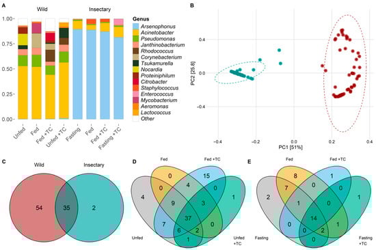 Structure and composition of gut microbiota of wild and insectary T. pallidipennis. (A) Barplot of the fifteen most common bacterial species according to log2-transformed relative abundances. Colours identify different genera; white denotes low-abundance taxa gathered as “Other”. Wild samples show higher diversity, with Acinetobacter and Pseudomonas predominating, while insectary insects are dominated by Arsenophonus. (B) PCoA based on weighted UniFrac distances shows clear separation between wild (red) and insectary (blue) samples, confirming origin as the main driver structuring the microbiota (PC1: 51%, PC2: 25.8%). (C) Venn diagrams comparing genera between wild (red) and insectary (blue) samples. Shared genera between wild and insectary insects are depicted in the overlapping section of the Venn diagram, indicating a conserved microbiota across origins. Venn diagrams depict species distribution across conditions in wild (D) and insectary (E) insects. Colours represent each state: grey (unfed), orange (fed), light blue (fed + T. cruzi), and green (unfed + T. cruzi). Wild insects display more exclusive taxa; insectary samples show more overlap.