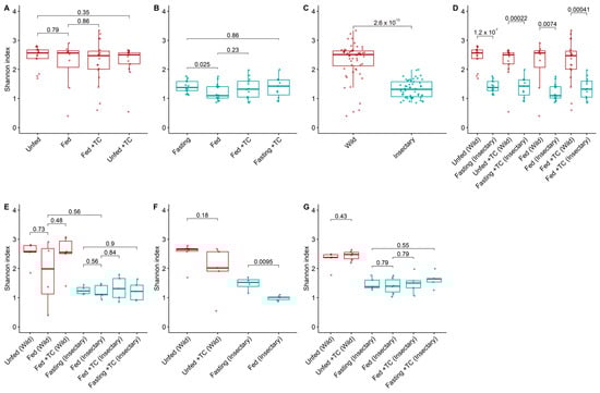 Bacterial diversity (Shannon index) in the gut microbiota of T. pallidipennis from different origins and physiological conditions. (A,B) Alpha diversity across experimental conditions in wild (A) and insectary (B) insects. With colours representing insect origin: red for wild and blue for insectary samples. Wild insects exhibited consistently higher diversity (Wilcoxon test), particularly under fasting conditions. (C) Overall comparison between wild and insectary samples. Diversity was higher in wild individuals (Wilcoxon, p-value < 0.001), reflecting broader environmental exposure. (D) Pairwise comparisons between wild and insectary groups under matched conditions. Insectary samples have consistently reduced diversity, regardless of feeding or infection status. (E–G) Diversity patterns in the stomach (E), intestine (F), and rectum (G) across all conditions. In all gut regions, wild insects maintain greater microbial diversity, while insectary groups display reduced diversity and higher intra-group uniformity. The largest differences were observed in the intestine (p-value = 0.0095) and stomach. In all panels, colour represents sample origin: red for wild, blue for insectary. For each comparison the Wilcoxon test was applied for non-parametric data (wild and cross-origin comparisons), and Student’s t-test for normally distributed data (insectary-only comparisons), as determined by a Shapiro–Wilk normality test.