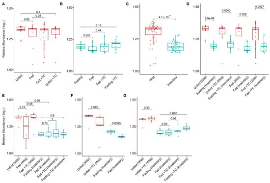 Log2-transformed relative abundance of gut bacterial genera in the microbiota of T. pallidipennis from different origins and physiological conditions. (A,B) Relative abundance across experimental conditions in wild (A) and insectary (B) insects. Colours represent sample origin: wild (red) and insectary (blue). Abundance was generally higher in wild insects (Wilcoxon test), particularly under fasting. (C) Overall comparison between wild and insectary samples confirms significantly higher abundance in wild individuals. (D) Matched comparisons across origin shows consistent reductions in abundance in insectary conditions. (E–G) Abundance patterns by gut region: stomach (E), intestine (F), and rectum (G). Significant differences (Student’s t-test) were observed in insectary insects, particularly between fasting and fed conditions in the intestine, and across multiple comparisons in the rectum. Data distribution was evaluated using the Shapiro–Wilk test to select appropriate statistical methods.