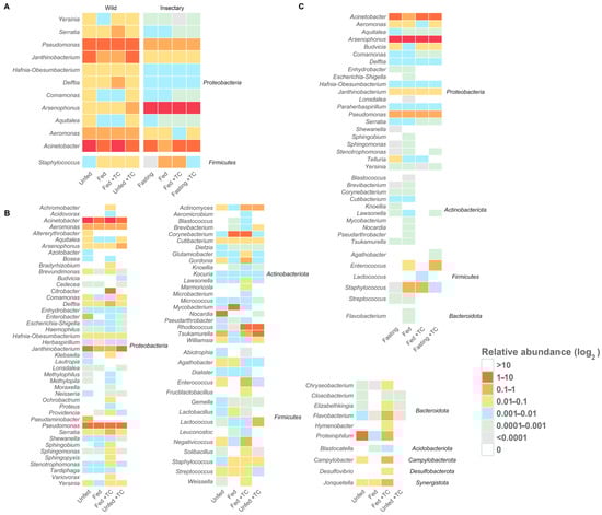 Core and origin-specific bacterial genera under different conditions in T. pallidipennis. Heatmaps show the log2-transformed relative abundance of gut bacterial genera under different origins and physiological conditions. (A) Core genera (twelve genera) are consistently present across all conditions, highlighting a stable microbiota component. (B) Insectary-specific genera show limited diversity and minor variation between conditions. (C) Wild-specific genera display greater diversity and marked compositional shifts with feeding and T. cruzi infection, indicating a more responsive and adaptable microbiota. Overall, wild insects host a more diverse and flexible community, whereas insectary insects maintain a simplified and stable profile.