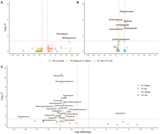 Differential abundance analysis under different conditions in wild and insectary insects. Genera with significantly different abundances are identified through pairwise comparisons using Wilcoxon or t-tests, depending on data distribution (Shapiro test) and including only genera detected in at least three replicates per condition. Only genera with adjusted p-values below 0.05 and absolute log2-fold changes greater than 1 are considered significant. Comparisons are visualised as volcano plots with point shapes representing specific contrasts: ▲ for Fed vs. Fasting, ● for TC + fasting vs. TC – fasting, and ■ for TC + fed vs. TC – fed. Dashed lines indicate the thresholds for significance: a horizontal line at –log10(p-value adjust ≤ 0.05) and vertical lines at log2-fold change = ±1. (A) In wild samples, Rhodococcus and Providencia are significantly more abundant in T. cruzi-positive fed insects. (B) In insectary samples, five genera show significant changes: Acinetobacter and Janthinobacterium increase in TC+ fasting, Budvicia in TC+ fed, and Pseudomonas in fed versus fasting insects. Notably, Arsenophonus decreases in TC+ fasting insects compared to TC−, indicating a negative association with infection under fasting in controlled conditions. (C) In cross-origin comparisons, genera such as Pseudomonas, Aeromonas, Delftia, and Cutibacterium are more abundant in wild insects under fasting, reflecting higher environmental exposure. Conversely, Arsenophonus is more abundant in insectary insects under the same TC + fasting condition compared to wild ones.