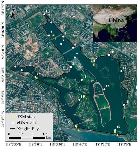 Situated in Xiamen City, Fujian Province, China, Xinglin Bay is geographically positioned between 29°46′71″ and 29°51′45″ N latitude, and 112°31′36″ to 112°37′30″ E longitude. Xinglin Bay, encompassing an area of approximately 6 km2 with an average depth of 2.5 m, was formed in 1956 following the construction of the Jixing Dam [23]. The salinity progressively rises from the freshwater inflow in the north (proximal to site 1) toward the southern estuarine region (site 4 for TSM; site 16 for eDNA) of Xinglin Bay. Situated at the mouth of the Houxi River, the dam marks a key geographical point. During the August 2024 fishery resource assessment in Xinglin Bay, the TSM approach was employed at six locations, while environmental DNA sampling was conducted at twenty different sites (each eDNA sampling site will conduct three parallel experiments to ensure the accuracy of the results) (Figure 1).