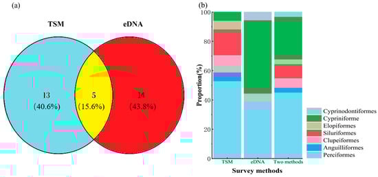 (a) Comparative species richness of fish identified via the traditional sampling method (TSM) and environmental DNA (eDNA) analysis. (b) Proportional representation of taxonomic order richness as detected independently by eDNA, TSM, and by the combination of both approaches.