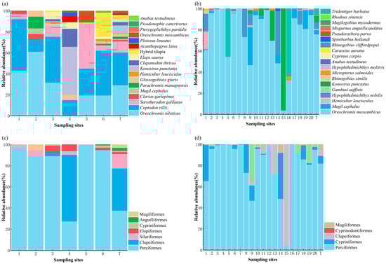 (a–d) Relative abundance (%) of fish taxa across sampling sites as determined by traditional sampling methods (TSM; panels a,c) and environmental DNA analysis (eDNA; panels b,d). Panels (a,b) represent species-level composition, while panels (c,d) show order-level composition. ‘T’ denotes the overall abundance at the reservoir-wide scale.