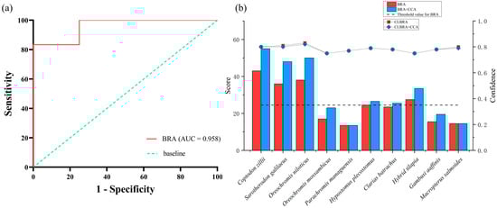 (a) Receiver-operating-characteristic (ROC) analysis illustrating the diagnostic performance of the AS-ISK evaluation for ten non-native fish species recorded in Xinglin Bay; (b) panel b displays the AS-ISK risk scores as bar charts with overlaid confidence levels shown as a line graph; the horizontal reference line represents the threshold identified by Youden’s J statistic.
