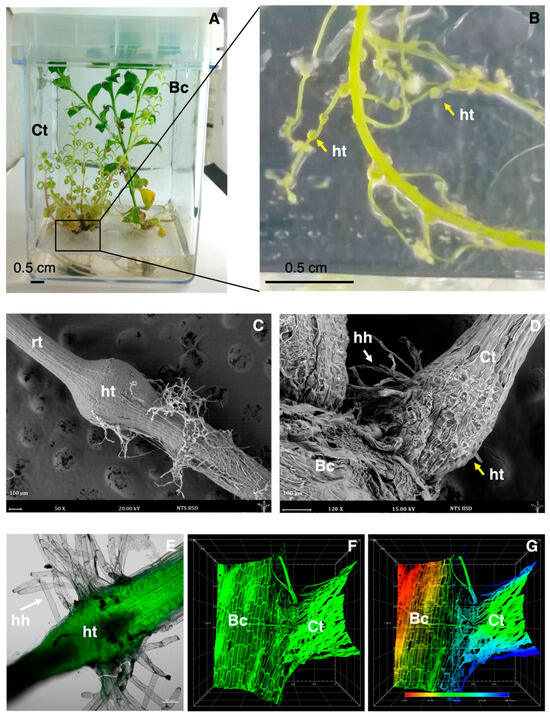 Representative images of the in vitro co-culture of Castilleja tenuiflora and Baccharis conferta (A) and plants of C. tenuiflora grown in co-culture showing the development of haustoria in the roots (B). Environmental Scanning Electron Microscopy micrographs of the roots of C. tenuiflora showing the development of haustorium (C) and the attachment to the roots of B. conferta (D). Laser scanning confocal microscopy micrographs of the haustoria of C. tenuiflora (E) developed in co-culture with B. conferta; (F,G) roots of C. tenuiflora and B. conferta attached in co-culture by haustorial bridge. Bc: Baccharis conferta; Ct: C. tenuiflora; ht: haustorium; hh: haustorial hairs; rt: roots. The yellow arrows indicate haustoria (ht), and the white arrows indicate haustorial hairs (hh).