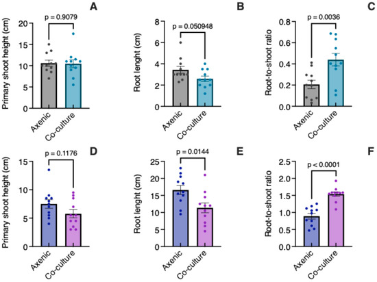 Castilleja tenuiflora (A–C) and Baccharis conferta (D–F) growth in axenic culture and co-culture. The root-to-shoot ratio is the ratio of root fresh weight to shoot fresh weight. Data are expressed as mean ± standard error (n = 11). Significant differences between axenic and co-culture plants were determined using an unpaired Student’s t-test (p < 0.05).
