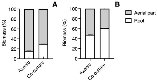 Proportion of total fresh biomass from aerial part and roots of Castilleja tenuiflora (A) and Baccharis conferta (B) in axenic culture and co-culture conditions.