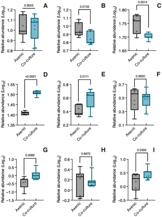 Data is presented as the mean ± standard error of the mean (SEM). The normal distribution was confirmed using the Shapiro–Wilk test. Unpaired Student’s t-test and p-value were used to examine significant differences between two conditions (axenic vs. co-culture). p-values less than 0.05 (p < 0.05) were considered statistically significant. All statistical analyses were performed using GraphPad Prism version 10.4.2 for macOS (GraphPad Software, Boston, MA, USA).