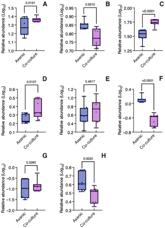 The relative abundance of hispidulin (t = 2.888, p = 0.0107) (Figure 5D, Table S4) increased significantly in co-culture, while acacetin (t = 9.517, p < 0.0001) (Figure 5F, Table S4) and 6-methoxykaempferide (t = 3.588, p = 0.0025) (Figure 5H, Table S4) significantly decreased. The relative abundance of cirsimaritin (t = 0.7542, p = 0.4617) (Figure 5E, Table S4) and pectolinaringenin (t = 1.013, p = 0.3260) (Figure 5G, Table S4) was similar in both axenic and co-culture conditions.