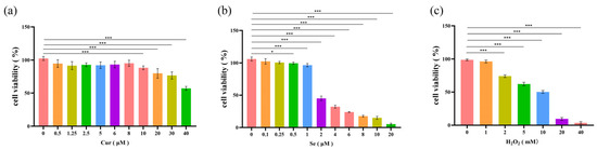 The drug application concentrations were determined by cell viability assays. IPEC-J2 cells were treated with different doses of Cur of Se for 24 (a,b) or treated with different doses of H2O2 for 2 h (c). Then the cell viability was detected by Cell Counting Kit 8. The average absorbance of the control group was set to 100%. The experiments were carried out in triplicate (n = 3). Abbreviation: Cur, Curcumin. Se, Selenium. *, p < 0.05; ***, p < 0.001.