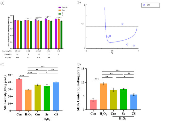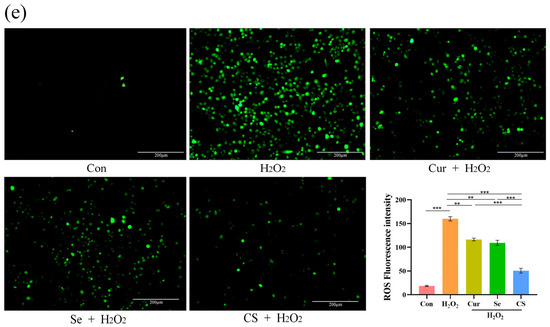 Moreover, the SOD, MDA, and ROS assays were conducted to confirm the synergy of Cur and Se. The results demonstrated that the MDA and ROS levels in the cells of the H2O2-treated group were significantly elevated, while the SOD activity was significantly reduced, compared to control group (p < 0.05); both Cur and Se, when applied individually, significantly alleviated the oxidative stress induced by H2O2 (p < 0.05), however, their combined application exerted more pronounced effects (Figure 2c–e).