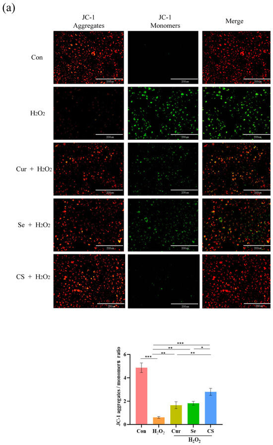 Mitochondrial membrane potential (MMP) is a key indicator of cellular energy metabolism, and its decline signifies the loss of mitochondrial function. The results of MMP detection revealed that H2O2 treatment significantly reduced MMP in IPEC-J2 cells compared to the control group (p < 0.05). Compared to the H2O2 group, Cur or Se alone significantly attenuated the decrease in MMP (p < 0.05), however, the combination of Cur and Se demonstrated a superior protective effect on MMP compared to either single treatment (p < 0.05, Figure 3a).