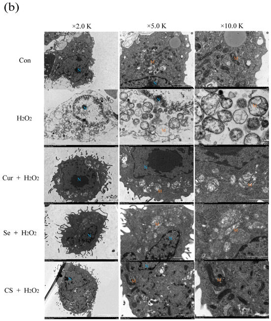 Moreover, the transmission electron microscopy (TEM) scanning results revealed that cells in the H2O2 group exhibited a large number of vacuoles, with mitochondria showing swelling, vacuolization, and disappearance of cristae, indicating that H2O2 caused severe damage to the mitochondria. In the single treatment groups with Cur or Se, the mitochondria still displayed vacuolization and swelling, but to a lesser extent than those in the H2O2 group. The mitochondrial morphology in the combination group was closest to that of the control group (Figure 3b).
