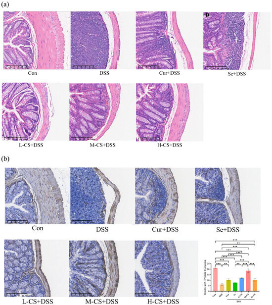 To assess the effects of Cur combined with Se on intestinal barrier function in mice, the expression of the tight junction protein ZO-1 was assessed using IHC assays. The ZO-1 protein was positively expressed in the colonic tissue of control group mice. In comparison with the control group, the expression of ZO-1 protein in the colonic tissue of the DSS group was significantly downregulated (p < 0.01). Compared with the DSS group, the difference in the Se group was not significant (p > 0.05), while the Cur group and the combination group showed significant increases (p < 0.05). Moreover, the expression level of ZO-1 protein in the colonic tissue of mice in the M-CS group was higher than that in the other drug-treated groups (p < 0.05, Figure 4b).