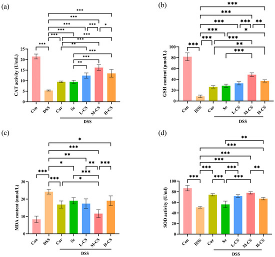 To evaluate the antioxidant capability of Cur and Se in ICR mice, the activity and content of CAT, GSH, MDA, and SOD in the serum of mice were detected. In comparison with the control group, the DSS group showed a marked reduction in CAT activity, SOD activity, and GSH content, while the MDA level was significantly elevated (p < 0.01); compared with the DSS group, Cur and Se both demonstrated significant antioxidant effects (p < 0.05), however, the serum antioxidant enzyme indices in the combination group were superior, particularly in the M-CS group (Figure 5).