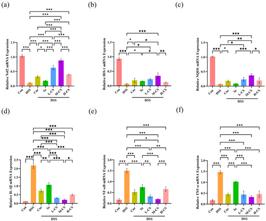 The Nrf2/HO-1/NQO-1 signaling pathway and the NF-κB signaling pathway are closely related to antioxidant and anti-inflammatory functions. To explore the potential antioxidant signaling mechanisms of Cur and Se, the mRNA expression levels of relevant genes in mice colonic tissues were determined by RT-qPCR. In comparison with the control group, the colonic tissues of the DSS group showed a significant decrease in the mRNA expression of Nrf2, HO-1, and NQO-1, whereas the mRNA expression of IL-1β, NF-κB, and TNF-α was markedly elevated (p < 0.05). Compared with the DSS group, both Cur and Se alone significantly upregulated the expression of the Nrf2 gene and downregulated the expression of IL-1β, NF-κB, and TNF-α genes (p < 0.05) but had no significant effect on the expression of HO-1 and NQO-1 genes (p > 0.05). In contrast, compared with the DSS and monotherapy groups, the colonic tissues of mice in the M-CS group exhibited significant upregulation of Nrf2, HO-1, and NQO-1 gene expression and significant downregulation of IL-1β, NF-κB, and TNF-α gene expression (p < 0.05). These findings indicated that the synergistic antioxidant effects of Cur and Se might be associated with the activation of the Nrf2/HO-1/NQO-1 pathway and the inhibition of the NF-κB-related pathway in colonic tissues of mice (Figure 6).