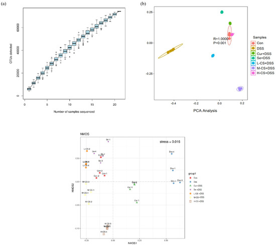 The gut microbiota is crucial for intestinal health. In order to evaluate the effects of Cur and Se on the gut microbiota, 16S rRNA sequencing was performed on fecal samples from the mice. A total of 785 OTUs were shared among the seven experimental groups, and the sequencing quantity and depth were sufficient (Figure 7a).