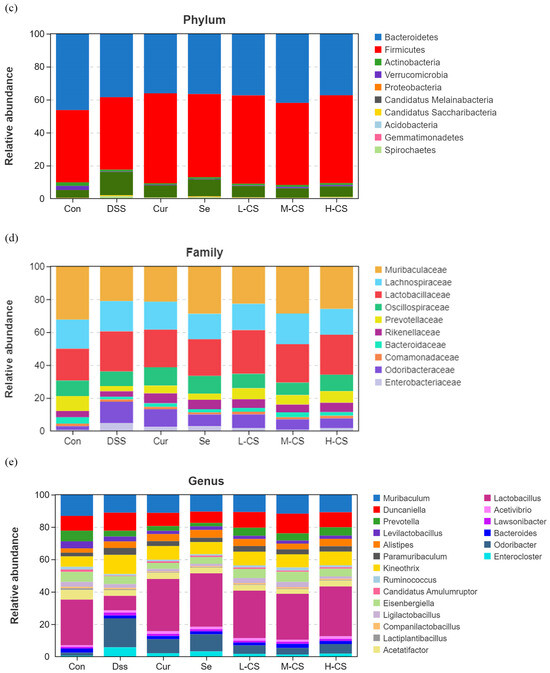 The beta diversity analysis revealed that the gut microbiota of mice in the DSS group was distinctly separated from that of the control group. The gut microbial structure of mice treated with Cur and Se, either individually or in combination, showed a noticeable recovery. Among them, the microbiota profile of the combination treatment group more closely resembled that of the control group (Figure 7b).
