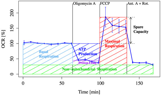 Sequential additions of mitochondrial inhibitors were performed during the assay: first, no additives were introduced to assess basal OCR; subsequently, oligomycin (final concentration: 0.6 µM) was added to inhibit ATP synthase and oxidative phosphorylation; FCCP (final concentration: 1 µM) was used to uncouple the proton gradient and induce maximum respiration; antimycin A (final concentration: 0.16 µM) was added to inhibit complex III; and, finally, rotenone (final concentration: 0.125 µM) was used to inhibit complex I. The OCR and extracellular acidification rate (ECAR) were measured following each injection [15].