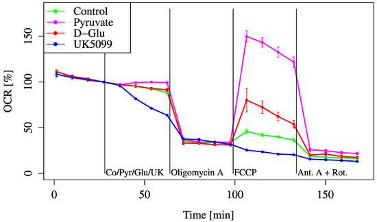 When UK5099 was added, a further decline was observed compared to the control. Even with the addition of FCCP, metabolism did not recover. Pyruvate improved both the baseline and maximum OCRs compared to glucose. The MOCR of glucose was lower than that of pyruvate, suggesting that glucose alone was not efficiently converted into mitochondrial substrates under these conditions. This implies that the glycolytic flux was limited, possibly due to a regulatory bottleneck in the glycolysis pathway, and that exogenous pyruvate bypassed this limitation by directly entering the mitochondria, leading to greater OCR recovery.