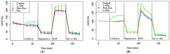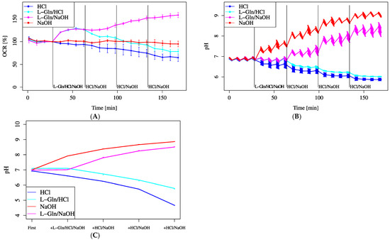 As a result, no change in the OCR was observed when the pH increased alone; however, the OCR tended to increase further when pH increased in addition to L-Gln loading, suggesting synergistic effects. No increase in the OCR was observed with only an increase in pH. In addition, L-Gln plus a decrease in pH tended to significantly decrease the OCR.