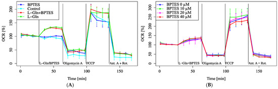 OCR modulation by BPTES. Cells were incubated in XF assay medium containing pyruvate (2 mM) and D-glucose (25 mM) to establish baseline respiration (time = 0). (A) OCR was measured after the addition of L-Gln (4 mM, final), BPTES (3 μM, final), or both. For the first drug injection (labeled as L-Gln/BPTES), the control received no additional treatment, whereas each treatment group received the indicated compounds. (B) OCR was evaluated with increasing concentrations of BPTES. All data are presented as mean ± SD; n = 5 per group.
