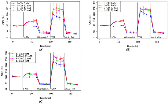 Furthermore, the effect of increasing L-Gln concentrations on MOCR was assessed across multiple concentration ranges. Within each range (20, 40, and 80 mM; 5, 10, and 20 mM; 1.25, 2.5, and 5 mM), no significant differences were observed among the different concentrations. There was a slight tendency toward a lower increase in OCR at the 1.25 mM concentration. However, in all ranges, each concentration resulted in a significantly higher MOCR compared to the 0 mM control (Figure 5A–C).