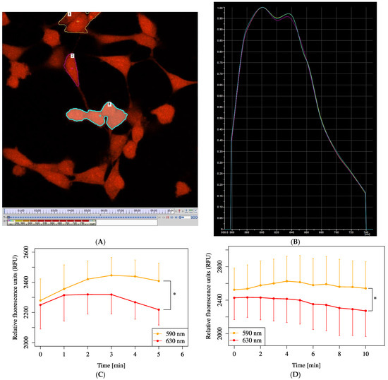 For measurements using the fluorescent indicator SNARF-1 (Invitrogen, Thermo Fisher Scientific, Waltham, MA, USA), the fluorescent images were collected using a confocal microscope system (A1R; Nikon, Tokyo, Japan) with 60× (NA 0.95) Plan-Apo lens (excitation: 487.5 nm, dichroic mirror: BS 20/80, emission: 550–750 nm/resolution 10 nm/10 ch spectroscopy). The fluorescence emission was recorded at 590.1–608.1 (590) nm and 630–648.2 (630) nm. As the difference in the emission ratio (590/630) was too small to evaluate chronological changes, the signal intensity difference (590 nm–630 nm) was evaluated to quantify relative pH changes.