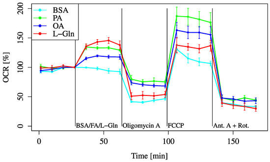 Similar findings were observed after FCCP administration; however, the maximum OCR increases induced by fatty acids were greater than those induced by L-Gln. Among the fatty acids, the OCR increase with PA was greater than that with OA.