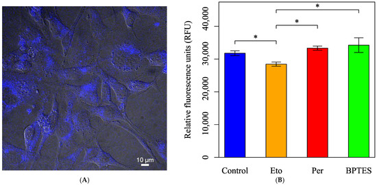 Evaluation of fatty acid metabolism using the FAOBlue dye. Cells were initially incubated in normal culture medium with pyruvate, D-glucose, and L-Gln. (A) The fluorescence image of the HEI-OC1 cells stained with FAOBlue. (B) Cells were treated with Eto (40 µM, final), Per (10 µM, final), or BPTES (3 µM, final), an inhibitor of glutaminase, for 30 min; were stained with FAOBlue in HBSS (+) for 30 min; and were measured to compare the effect of fatty acid oxidation activity. All data are presented as mean ± SD. n = 6 per group. Statistical comparisons were performed using two-tailed unpaired t-tests. Significant differences were observed between the following groups: Control vs. Eto (*: p = 0.015), Control vs. Per (*: p = 0.038), Eto vs. Per (*: p = 0.010). p values less than 0.05 were considered statistically significant.