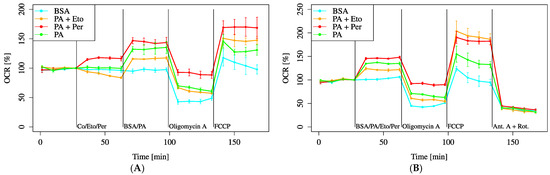Comparison of OCR recovery with etomoxir (Eto) and perhexiline (Per). Cells were incubated in an XF assay medium containing pyruvate (2 mM), D-glucose (24.7 mM), and L-carnitine (775 μM) to establish the baseline (time = 0). (A) Eto (40 μM, final) and Per (10 μM, final) were added sequentially, followed by BSA. (B) Eto, Per, and BSA were simultaneously added. All data are shown as mean ± SD; n = 5 per group.