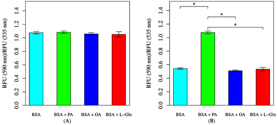 Mitochondrial membrane potential measured by JC-1 staining. Cells were incubated in an XF assay medium containing pyruvate (2 mM), D-glucose (24.7 mM), and L-carnitine (775 μM) to establish the baseline (time = 0). Mean of fluorescence intensity ratios were measured after treatment with BSA (0.034 mM, final), L-Gln (4 mM, final), BSA + palmitic acid (PA, 0.2 mM, final), or BSA + oleic acid (OA, 0.2 mM, final). (A) JC-1 fluorescence intensity ratio at baseline (p = 0.2203). (B) JC-1 fluorescence intensity ratio following BSA/PA/OA/L-Gln injection and 30-min incubation at 33 °C. Statistical significance was assessed using ANOVA. All data are presented as mean ± SD; n = 6 per group; *: p < 0.001.
