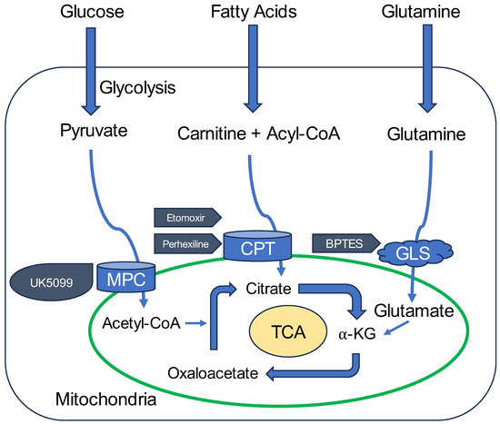 Conceptual summary of mitochondrial metabolic pathways and regulation by inhibitors. This schematic illustrates key mitochondrial metabolic pathways examined in this study, including glucose, amino acid (particularly L-Gln), and fatty acid oxidation. The figure integrates findings from OCR analyses and highlights the roles of specific metabolic inhibitors. UK5099 inhibits mitochondrial pyruvate carrier (MPC), thereby blocking the entry of pyruvate into mitochondria. Eto irreversibly inhibits carnitine palmitoyl transferase 1 (Cpt1), suppressing mitochondrial β-oxidation of fatty acids. Perhexiline reversibly inhibits Cpt1, leading to partial suppression of fatty acid oxidation. BPTES targets Gls1, an enzyme involved in L-Gln metabolism, though its inhibition did not suppress L-Gln-induced OCR elevation in HEI-OC1 cells. MPC: mitochondrial pyruvate carrier, CPT: carnitine palmitoyltransferase, GLS: glutaminase, TCA: tricarboxylic acid cycle, α-KG: α-ketoglutaric acid.