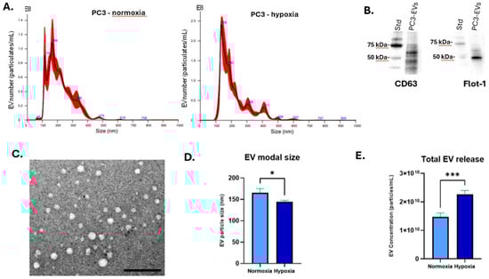 In brief, PC3 cells were cultured to 80% confluence in T75 flasks, the medium removed, the cells were washed with DPBS and fresh medium, without FBS (to avoid contamination with FBS-derived EVs), was applied for 6 h, and the flasks were kept at normoxia or hypoxia, respectively. Thereafter, the EV-containing media were collected and centrifuged at 4000× g for 20 min at 4 °C to remove cellular debris and aggregates. The EV-containing supernatants were then centrifuged at 100,000× g by ultracentrifugation for 1 h at 4 °C. The EV-enriched pellets were resuspended in 1 mL DPBS (filtered through a sterile 0.22 μM filter) and ultra-centrifuged again at 100,000× g for 1 h at 4 °C, after which the DPBS supernatant wash was discarded. The final EV pellets were resuspended in 50 μL DPBS and subjected to nanoparticle tracking analysis (NTA) for quantification and size profiling, to Western blotting for surface marker detection and imaged by transmission electron microscopy (TEM).