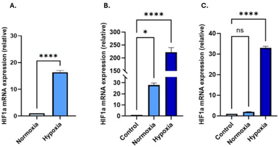 HIF1-α expression levels in (A) EVs isolated from PC3 cells cultured under normoxic or hypoxic conditions (light blue: PC3 EV normoxia, blue: PC3 EV hypoxia). (B) HIF-1α mRNA levels in PNT2 and (C) LNCaP cells following treatment with PC3-derived EVs compared to untreated cells receiving no EVs. PC3-EVs from hypoxic conditions significantly upregulated HIF-1α expression in both recipient cell lines, compared to untreated cells and cells receiving EVs derived from normoxia-treated PC3 cells. (B,C: Light blue: untreated cells receiving no EVs; blue: normoxia-EV treated cells; dark blue: hypoxia-EV treated cells). The bar graphs represent the mean of three RNA replicates isolated from control and EV-treated PNT2 and LNCaP cells. Data analysed using two-way ANOVA followed by Šídák’s test. Data normalised according to RPII expression and analysed using fold analysis n = 3, * p ≤ 0.05; **** p ≤ 0.0001; ns = not significant; error bars indicate SD.