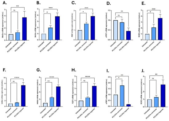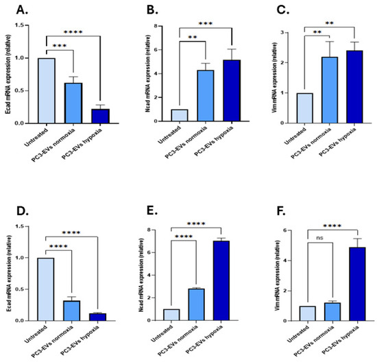 In LNCaP cells, Ecad expression was downregulated by 0.12-fold in the hypoxia-EV-treated group and by 0.31-fold in the normoxia-EV-treated group when compared to untreated LNCaP cells (n = 3; p < 0.0001 for both; Figure 4D). Ncad was significantly upregulated by 7.04-fold (n = 3; p < 0.0001) following PC3 hypoxia-EV application, compared to 2.81-fold in response to normoxia-EV application (n = 3; p < 0.0001, Figure 4E). In comparison, Vim expression was only significantly upregulated following treatment with the PC3 hypoxia-EVs (4.90-fold; p < 0.0001), and no significant change was observed following treatment with the PC3-EVs from normoxia conditions compared with untreated cells receiving no EVs (n = 3; 1.22-fold; p < 0.05, Figure 4F).
